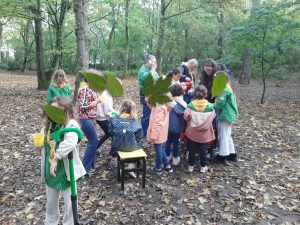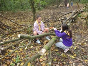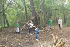 Dit keer gingen we bouwen zonder touw en dat ging jullie eigenlijk best wel goed af. Gigantische boomstammen werden in “ oksels “ van bomen gelegd en als een tak te lang was pakten jullie gewoon een zaag. Jullie zaagden heel goed en van De Speurdersleiding mochten we twee oude krukjes lenen als “werkbank “.