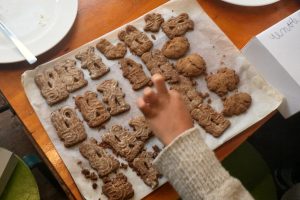 De eerste bakronde bestond uit het maken van het speculaasdeeg en dat moest natuurlijk heel goed gekneed worden. Uiteindelijk hadden de drie groepjes drie supermooie speculaasdeegballen, dus de prachtige speculaasplanken konden worden gevuld. Nu was het duidelijk dat er bij bakken ook heel veel geluid om de hoek komt kijken, want om de speculaasjes los te krijgen moest je de planken heel hard op de tafels slaan……