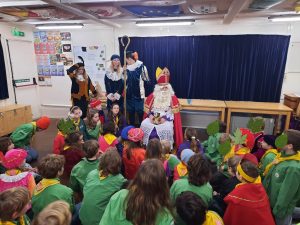 Toen we alles gedaan hadden liepen we weer terug naar ons clubhuis en halverwege werden we opgevangen door drie hele toffe Pieten. Zij brachten ons naar Sinterklaas die écht heel blij was dat hij jullie weer zag en hij toonde ook trots zijn mijter die hij vorig jaar nog vergeten was….