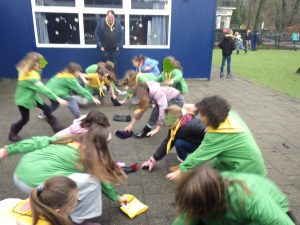 We waren vandaag ook met een complete horde en dan weten jullie het wel, het was weer tijd voor een groepsfoto ! Maar eerst deden we het reactiespel met de Wintermutsen. Twee partijen stonden tegenover elkaar en in het midden had elk tweetal een wintermuts liggen. Nu was het opletten, want er volgden een heleboel opdrachten voordat er ineens “ MUTS “ werd geroepen. Degene die als eerste dan de muts wist te pakken kreeg een punt. Het was razend spannend én we wisselden regelmatig van tegenspeelster. Het werd helemaal lachen toen een leider van De Speurders ineens “Muts “ riep…..jullie reageerden meteen en ook dit maal waren er gelukkig geen botsingen met het hoofd.